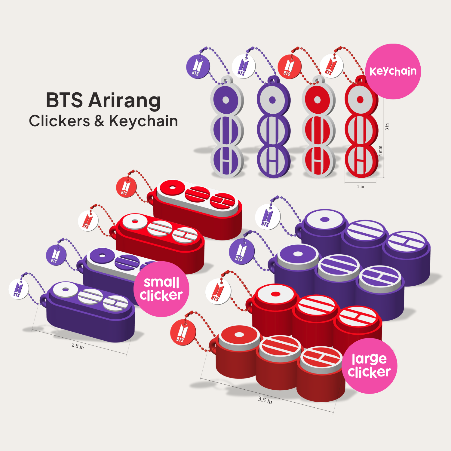 Customize your vibe with red or purple color combinations, each paired with a BTS charm